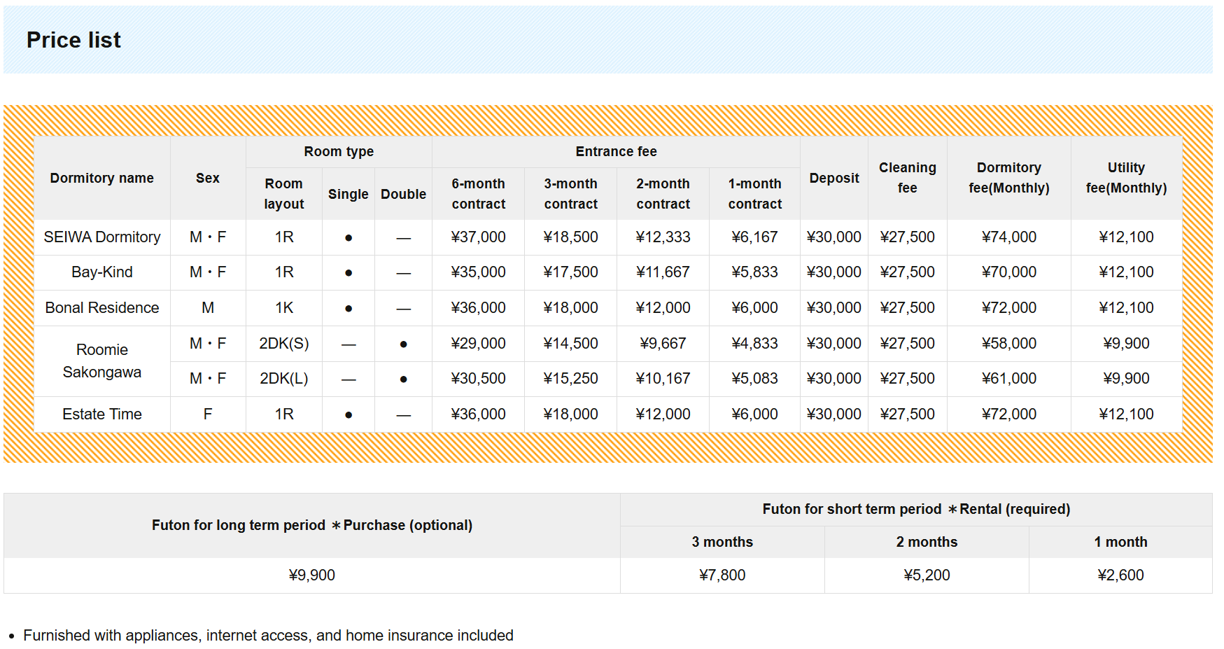 Постельные принадлежности: 9 900 иен (покупка), 7 800 иен (аренда)